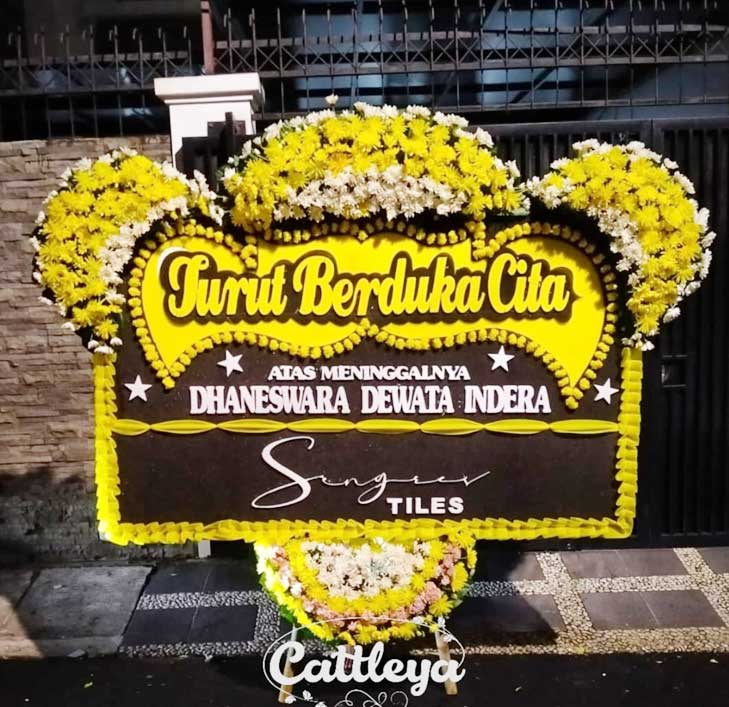 Karangan papan bunga model Jakarta untuk acara dukacita yang terbuat dari styrofoam ukuran 200 cm x 150 cm dengan 3 jambul. Hasil rangkai rapi dan memuaskan.