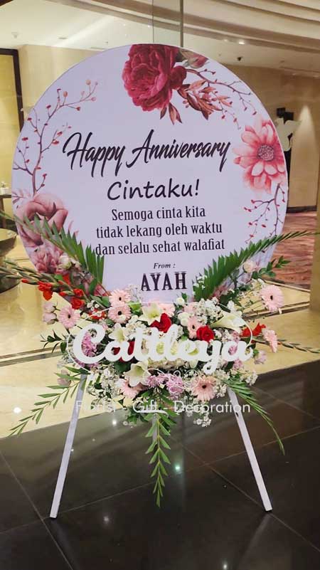 Karangan bunga papan indoor ini dipesan untuk acara happy anniversary sebagai bentuk ucapan selamat.