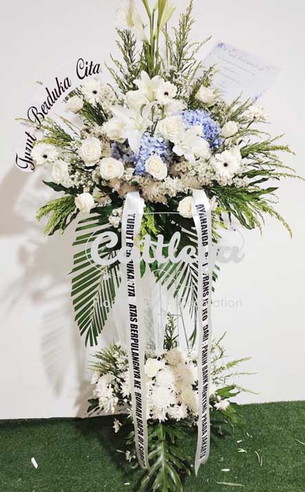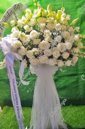 Rangkaian bunga duka standing untuk acara dukacita menggunakan bahan bunga segar. Kami menerima pesanan untuk acara di Medan maupun luar kota, harga murah dan pengantaran cepat ke lokasi rumah duka