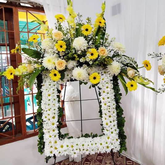 Rangkaian bunga frame atau bingkai bunga saat acara dukacita dengan menampilkan foto orang yang meninggal dunia di tengah - tengah bunga sebagai bentuk penghargaan