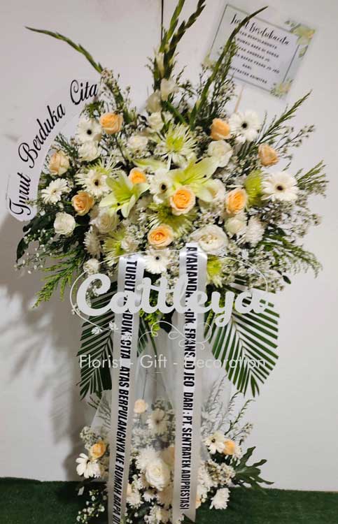 Rangkaian standing flower dukacita memakai bahan bunga segar
