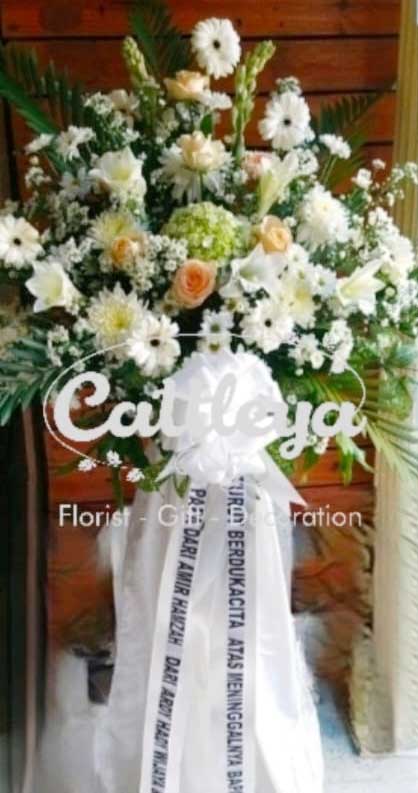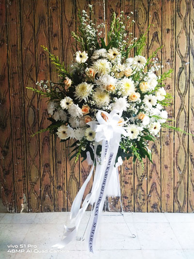 Rangkaian bunga standing segar harga murah untuk acara dukacita, biasanya di letakkan berdiri di sudut ruangan duka atau di dalam rumah duka dengan menggunakan penyangga besi yang kuat dan kokoh
