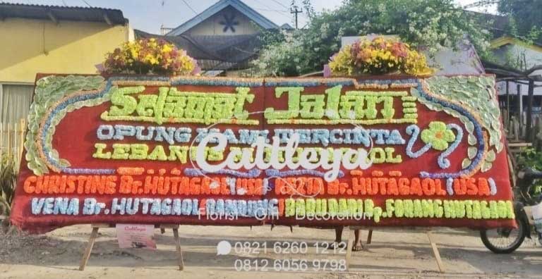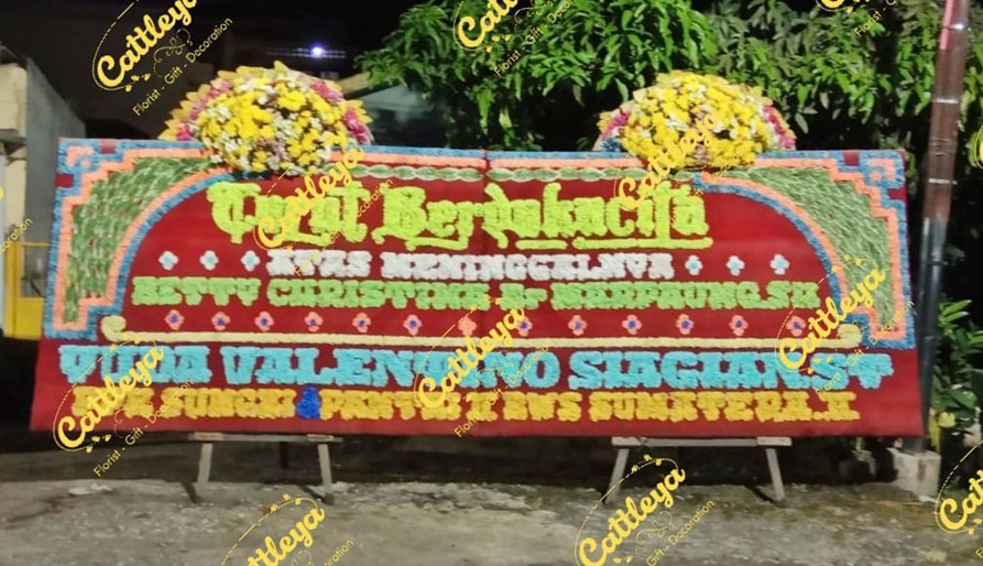 Karangan bunga papan gandeng model kota Medan dengan paduan 2 mahkota bunga segar di atas papan