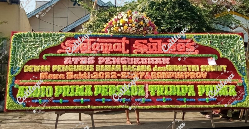 Karangan bunga papan gandeng model kota Medan dengan tambahan 1 mahkota bunga segar di atas papan, harga sewa murah untuk acara sukacita dan dukacita