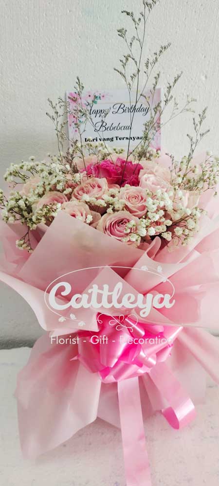 Buket bunga segar cantik berkualitas warna pink yang terdiri dari baby bride, bunga mawar, kaspia. Dikemas sangat indah, harga murah dan gratis ongkir. Cocok diberikan kepada seseorang yang sedang merayakan ulang tahun sebagai ucapan selamat (happy birthday)