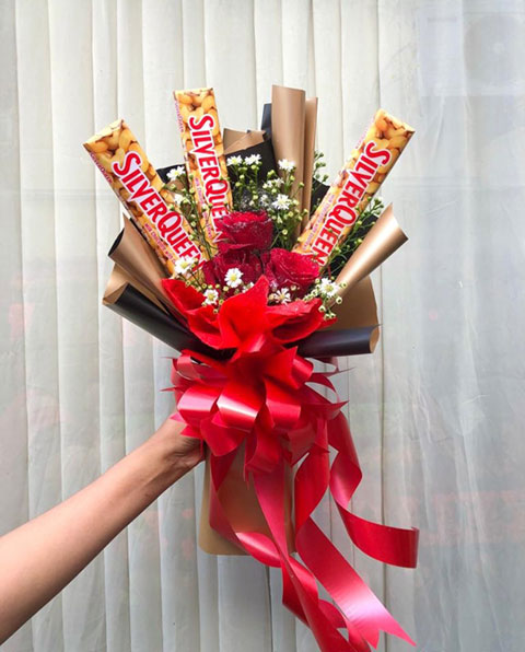 rangkaian buket bunga mawar merah dan coklat silverqueen