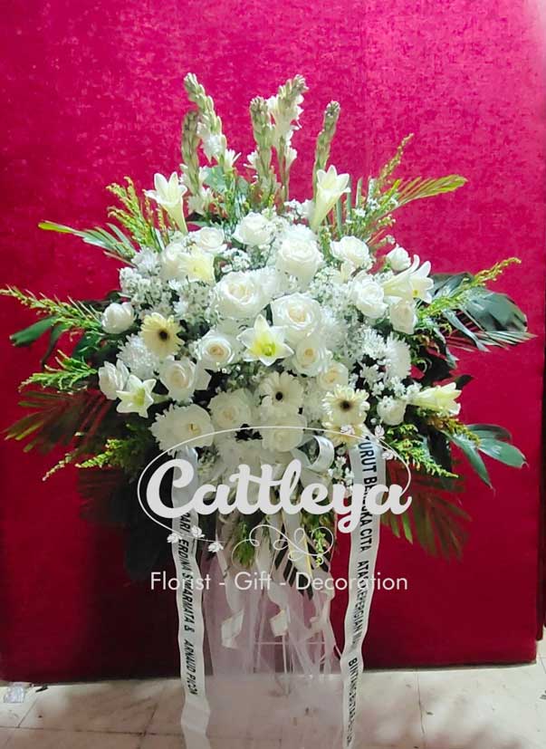 Rangkaian standing flower untuk acara dukacita menggunakan bahan bunga segar untuk di tempatkan di rumah duka